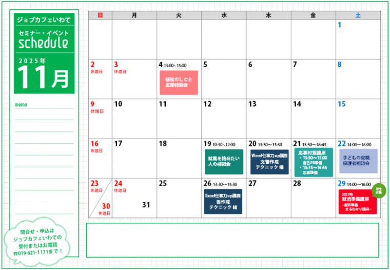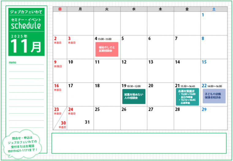 2025.10.31 すべての方 2025年11月のジョブカフェいわてイベントカレンダーを公開しました ジョブカフェいわてで開催する、セミナーやトークイベントなどの開催予定カレンダーを公開しました。(2025.10.31現在) 一覧へもどる