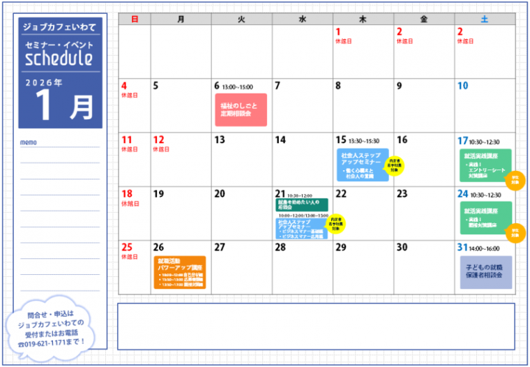 2025.12.26 すべての方 2026年1月のジョブカフェいわてイベントカレンダーを公開しました ジョブカフェいわてで開催する、セミナーやトークイベントなどの開催予定カレンダーを公開しました。(2025.12.27現在) 一覧へもどる
