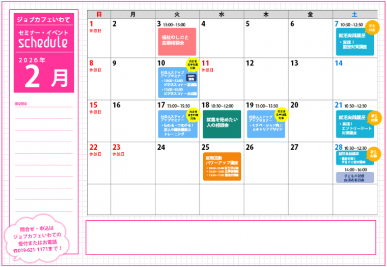 2026.02.02 すべての方 2026年2月のジョブカフェいわてイベントカレンダーを公開しました ジョブカフェいわてで開催する、セミナーやトークイベントなどの開催予定カレンダーを公開しました。(2026.1.29現在) 一覧へもどる
