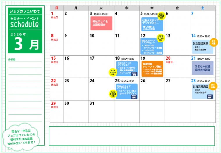2026.02.27 すべての方 2026年3月のジョブカフェいわてイベントカレンダーを公開しました ジョブカフェいわてで開催する、セミナーやトークイベントなどの開催予定カレンダーを公開しました。(2026.2.27現在) 一覧へもどる