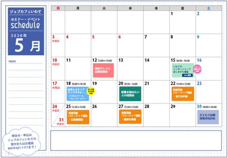 2026.04.24 すべての方 2026年5月のジョブカフェいわてイベントカレンダーを公開しました ジョブカフェいわてで開催する、セミナーやトークイベントなどの開催予定カレンダーを公開しました。(2026.4.24現在) 一覧へもどる